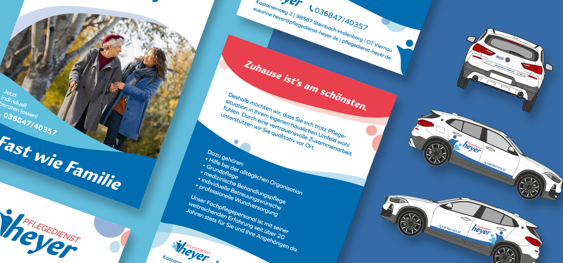 Das neue Design fand auch in verschiedenen Anzeigen und Flyern Anwendung. Durch eine freundliche und natürliche Bildauswahl wird der neu entwickelte Slogan "Fast wie Familie" visuell unterstützt. Man soll sich zu Hause gut aufgehoben fühlen, auch wenn man durch externe Pflegekräfte betreut wird. Unsere Textvorschläge unterstreichen die familiäre Ansprache zusätzlich.