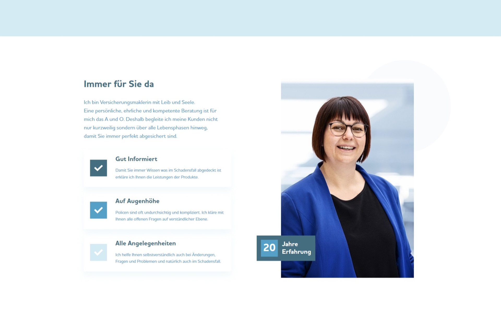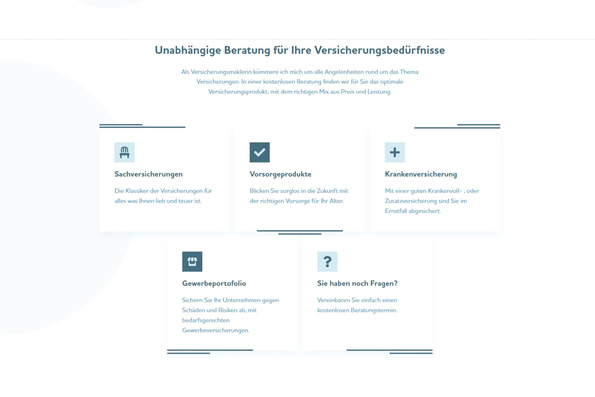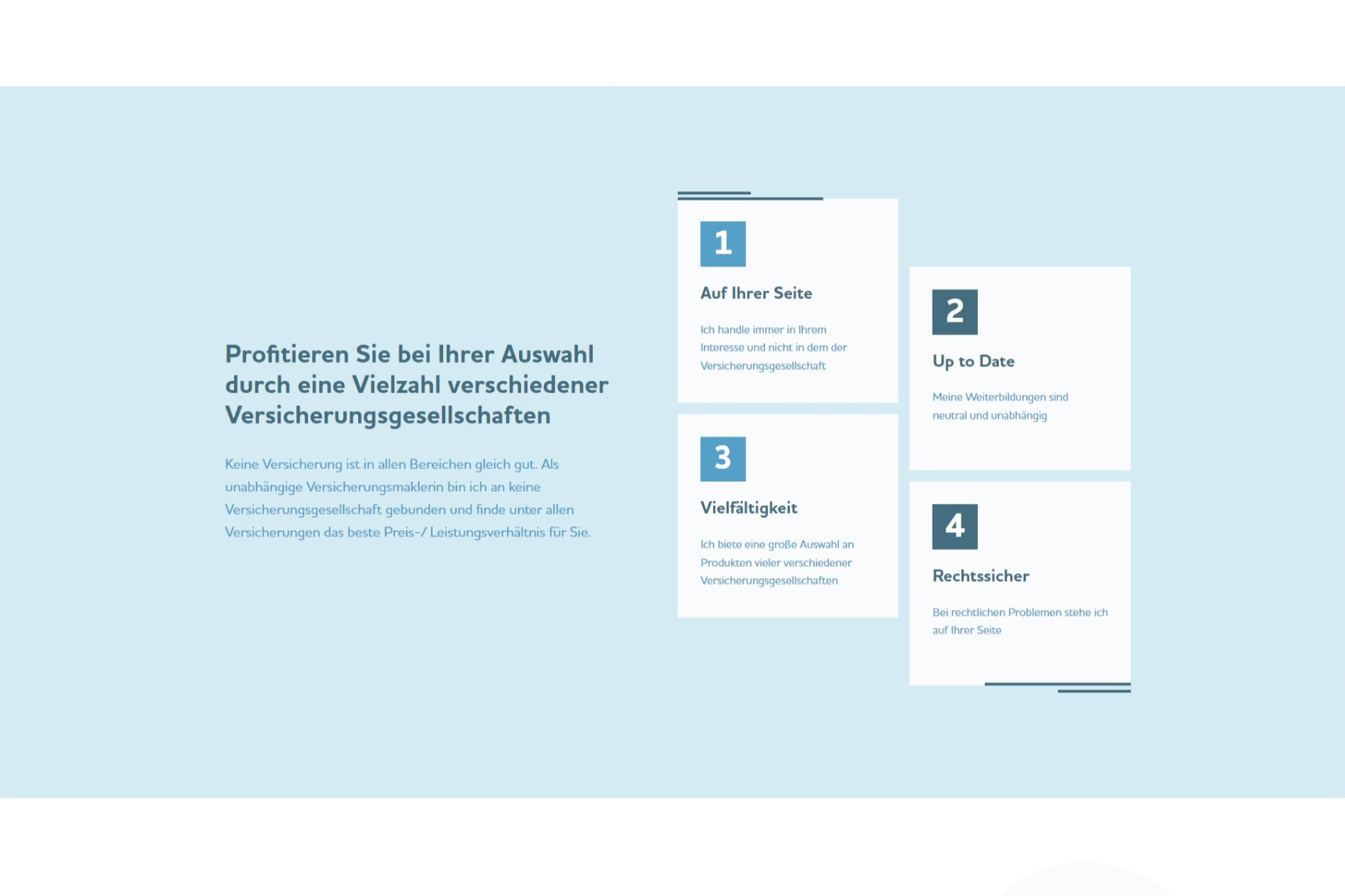 Durch den strukturierten Aufbau der Website und die kurzen, übersichtlichen Informationsblöcke gelingt es Interessenten einen schnellen Überblick über das Dienstleistungsspektrum und wichtige Informationen zu erhalten. Lange Erklärungen wurden bewusst vermieden, da die Beratung zur passenden Versicherung sehr individuell ist.