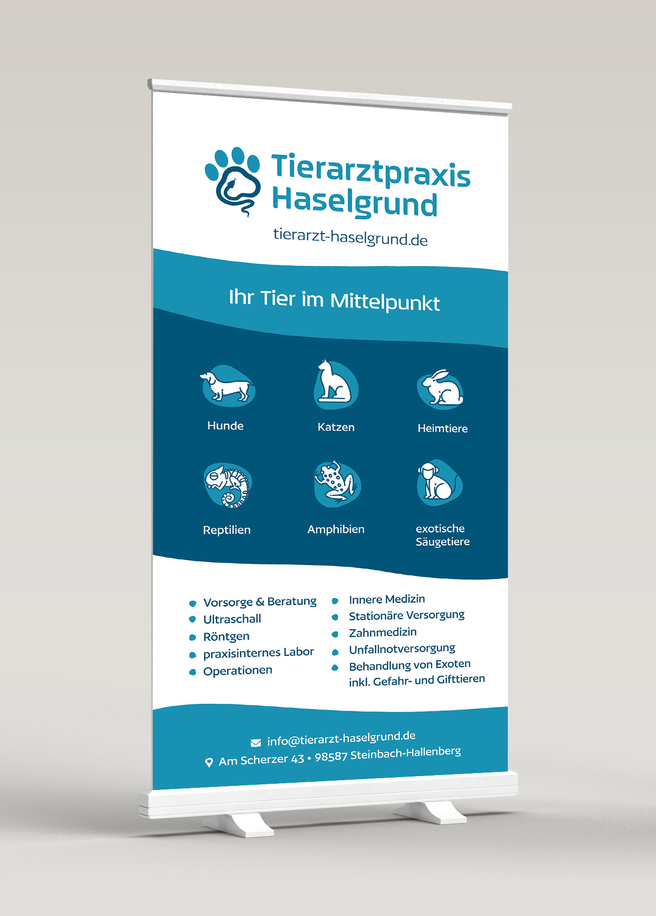 Dein Tier im Mittelpunkt Für die Tierarztpraxis Haselgrund steht die perfekte persönliche Beratung und optimale Behandlung der tierischen Begleiter an erster Stelle. Dafür haben wir ein umfassendes Designgesamtpaket entwickelt – vom Corporate Design über die Innenraumgestaltung bis hin zur Website.