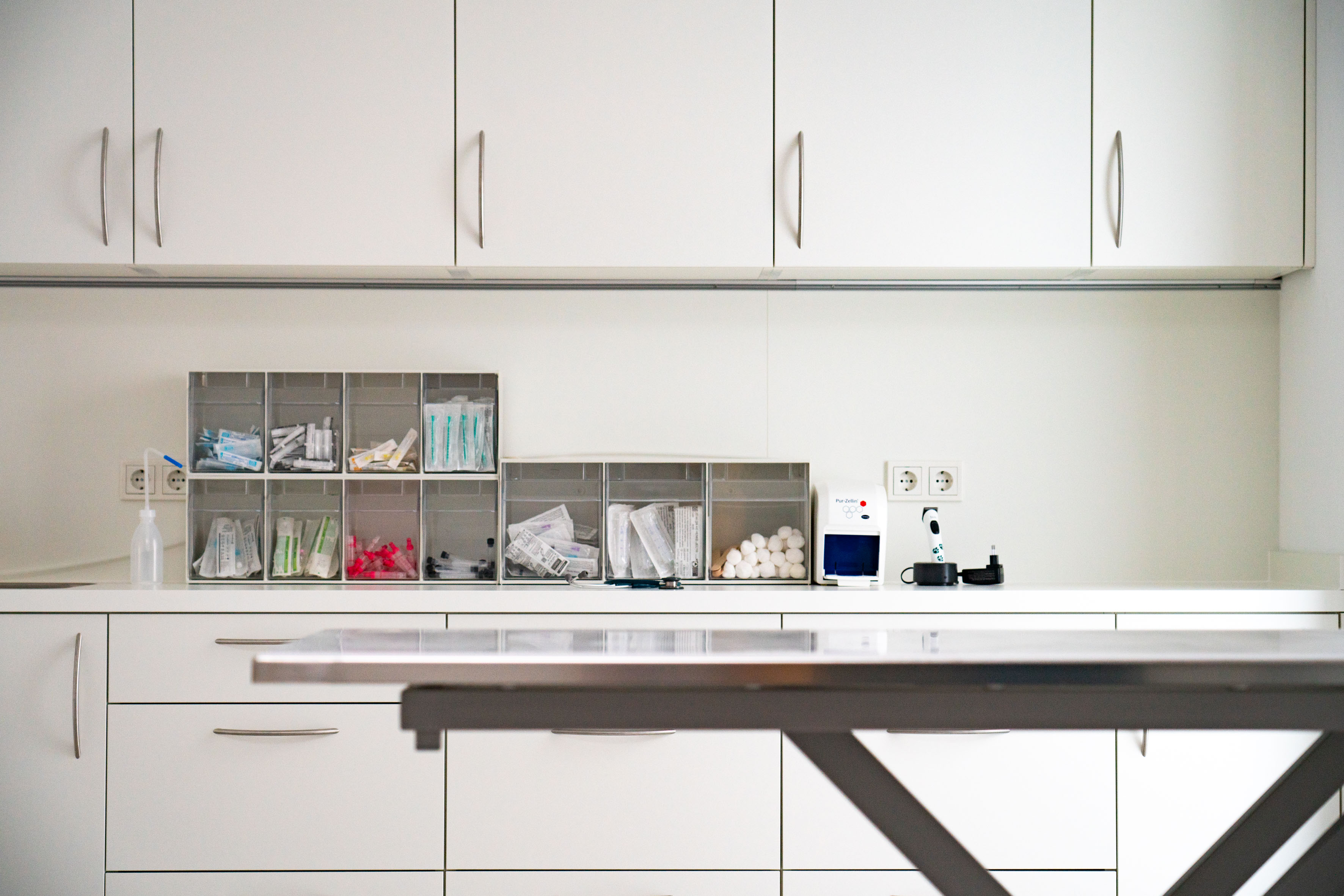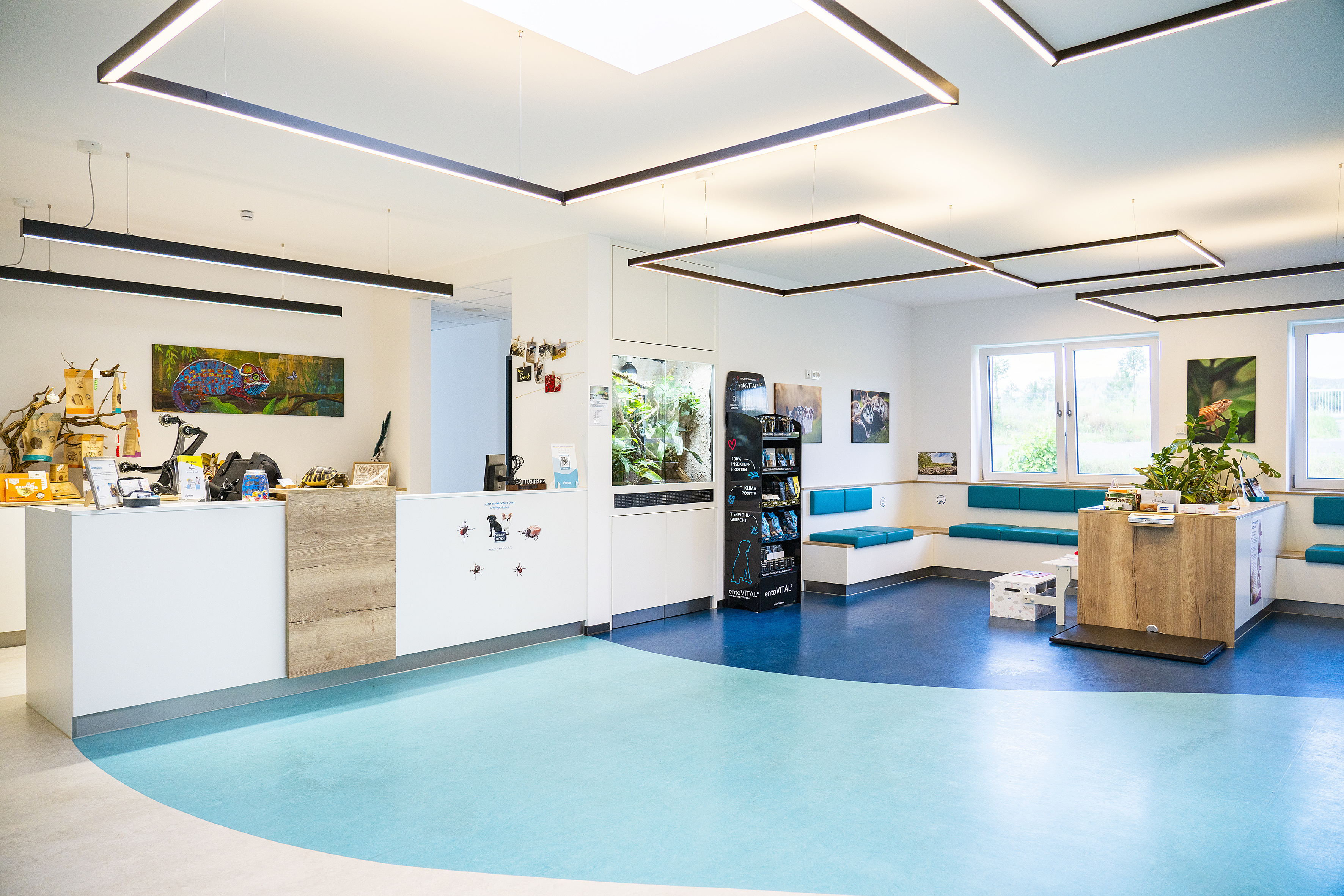 Die organischen Formen im Gesamtkonzept sorgen für einen leichten, lockeren Eindruck. Da hier meist kranke Tiere im Mittelpunkt stehen, sind Gespräche und Situationen oft emotional aufgeladen. Ein steifes, starres Design wäre unpassend.