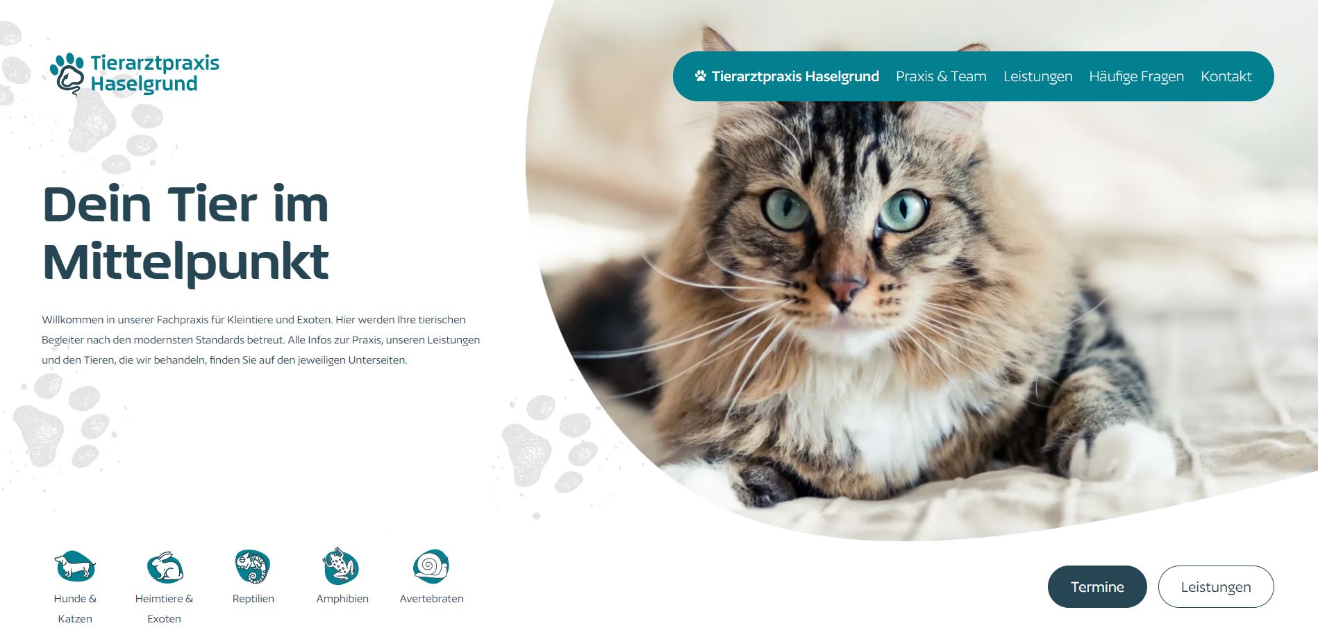 Für den Onlineauftritt der Tierarztpraxis standen die Nutzerfreundlichkeit und das einfache Auffinden von Informationen an erster Stelle. Kunden soll es leichtfallen Informationen einzuholen, ohne sich durch komplizierte Unterseitenstrukturen durchklicken zu müssen. Deshalb haben wir mit Hilfe von Icons die verschiedenen Tierarten, die behandelt werden, grafisch eingebunden. Dadurch kann sich der Tierbesitzer zunächst orientieren, welchen Typ Haustier er hat und welche Leistungen speziell für diese Tierart angeboten werden. Für häufige Fragen gibt es eine FAQ-Seite. Damit geben wir dem Patientenbesitzer erste Informationen und reduzieren die Wahrscheinlichkeit der übermäßigen telefonischen Nachfragen für die Praxis.