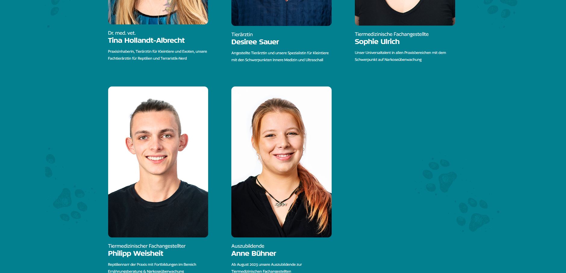 Die Designelemente aus dem Branding ziehen sich auch hier konsequent durch. Organische Formen und die beiden Brandingfarben setzen Bilder und Headlines in Szene. Zur Auflockerung wurden im Hintergrund Pfotenabdrücke eines Hundes gesetzt. Somit fließt ein logoähnliches Grafikelement nochmal mit ein und der tierische Charakter wird verstärkt.
