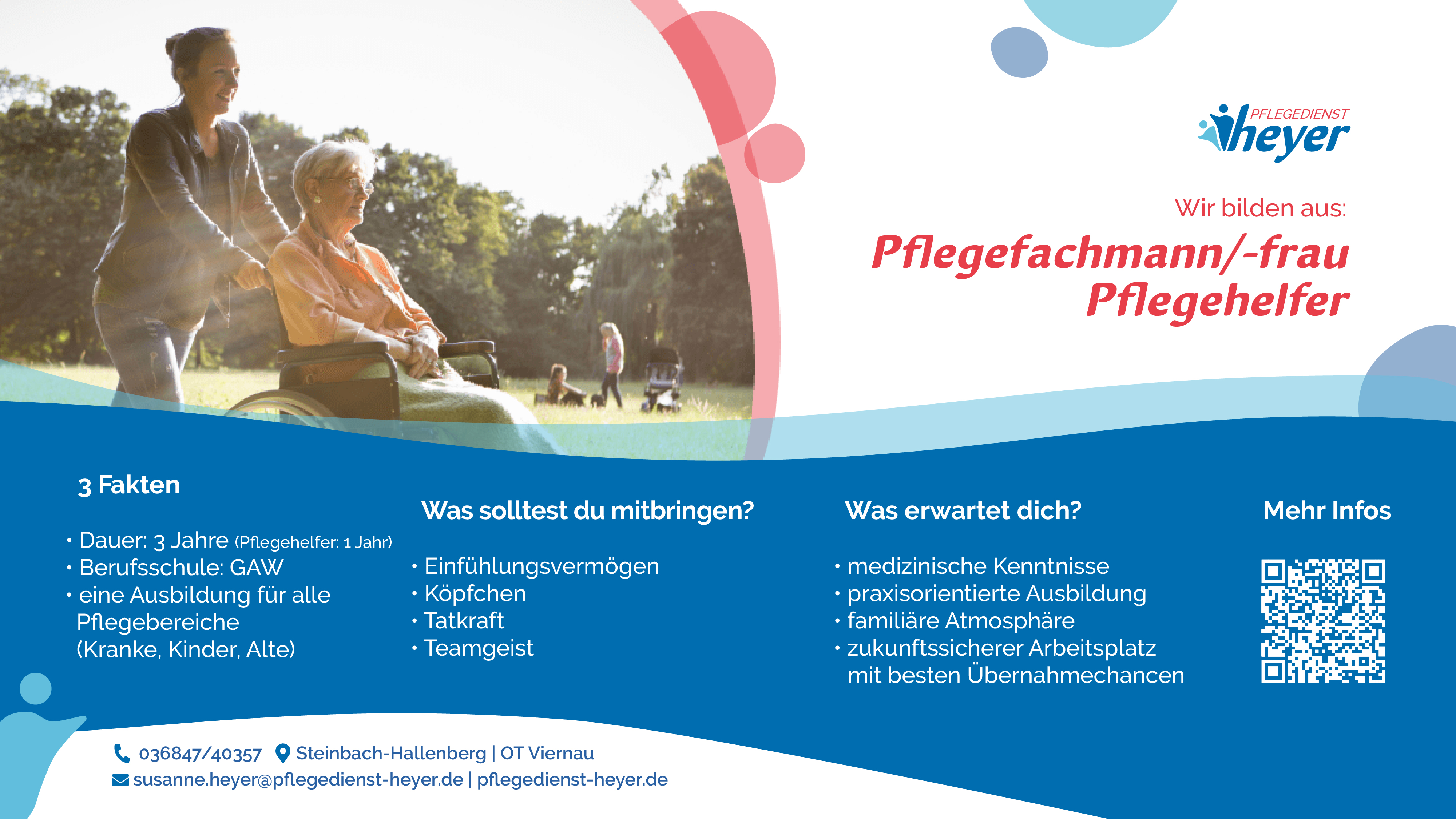 Zur Berufsorientierung für künftige potentielle Fachkräfte unterstützt das Unternehmen die Talent Company der Strahlemann-Stiftung an der örtlichen Regelschule. Hierfür entwickelten wir gebrandete Präsentationsgrafiken zu den Berufsbildern und Praktikumsmöglichkeiten im Bereich Pflege.