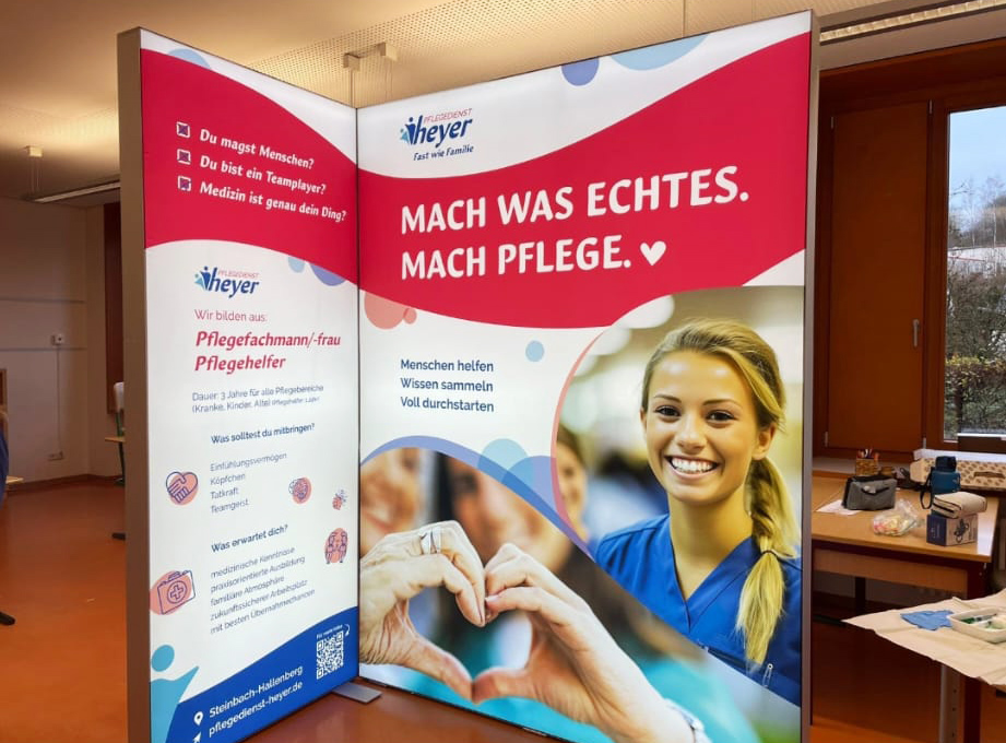 Mit dem Ziel der Azubigewinnung haben wir das Messedesign für den Stand umgesetzt. Nach der strategischen Konzeptphase wurden Text und Inhalte in ein brandingkonformes Design gegossen. Die zielgruppengerechte Ansprache und ein einladendes, zeitgemäßes Gesamtbild standen dabei im Fokus.