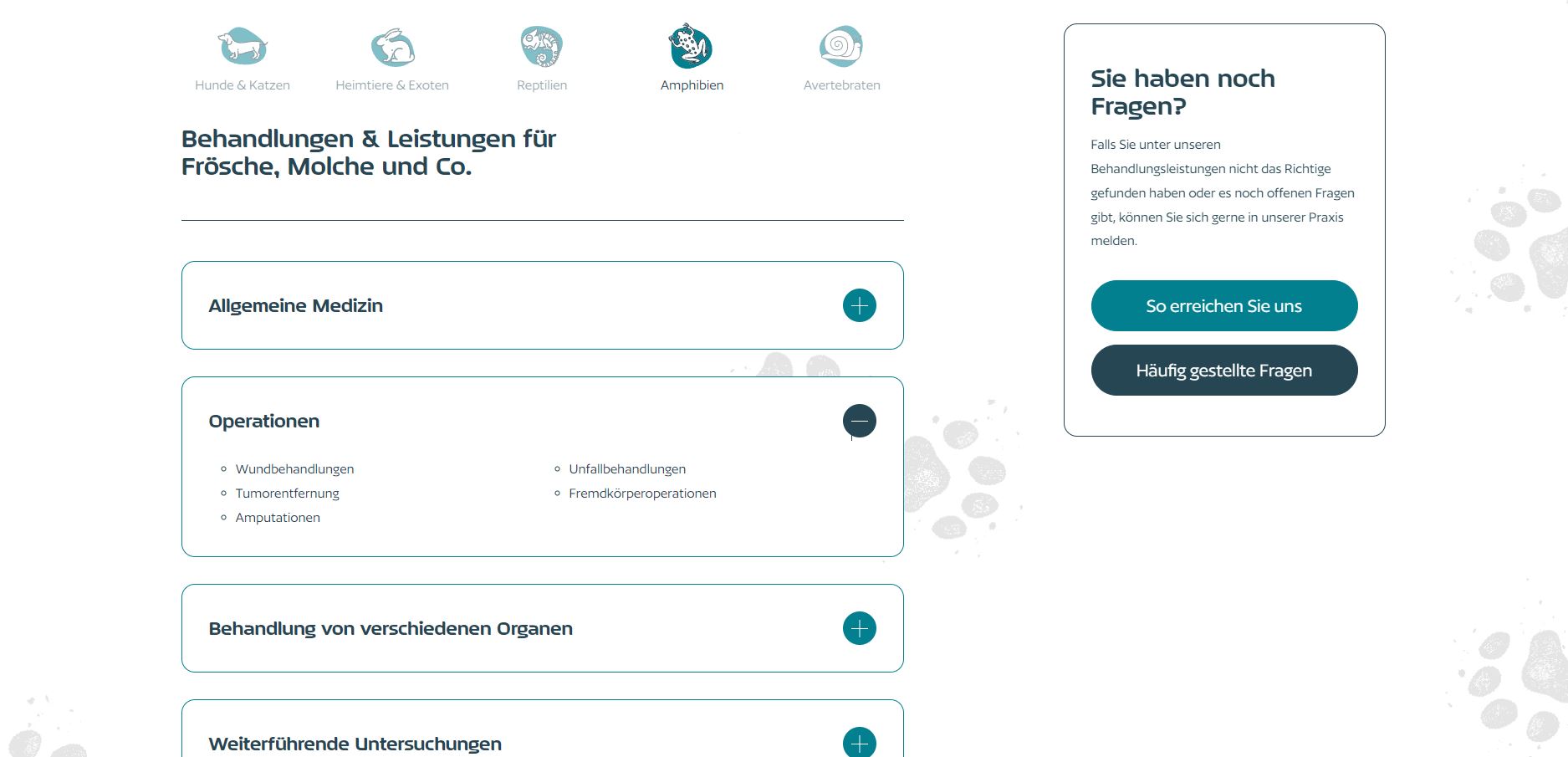 Für den Onlineauftritt der Tierarztpraxis standen die Nutzerfreundlichkeit und das einfache Auffinden von Informationen an erster Stelle. Kunden soll es leichtfallen Informationen einzuholen, ohne sich durch komplizierte Unterseitenstrukturen durchklicken zu müssen. Deshalb haben wir mit Hilfe von Icons die verschiedenen Tierarten, die behandelt werden, grafisch eingebunden. Dadurch kann sich der Tierbesitzer zunächst orientieren, welchen Typ Haustier er hat und welche Leistungen speziell für diese Tierart angeboten werden. Für häufige Fragen gibt es eine FAQ-Seite. Damit geben wir dem Patientenbesitzer erste Informationen und reduzieren die Wahrscheinlichkeit der übermäßigen telefonischen Nachfragen für die Praxis.