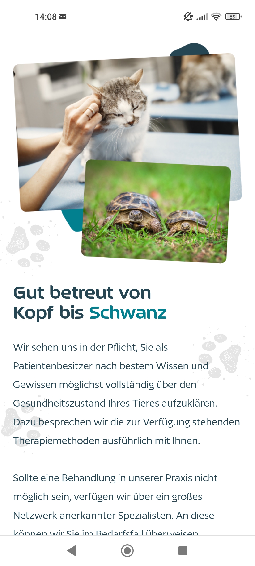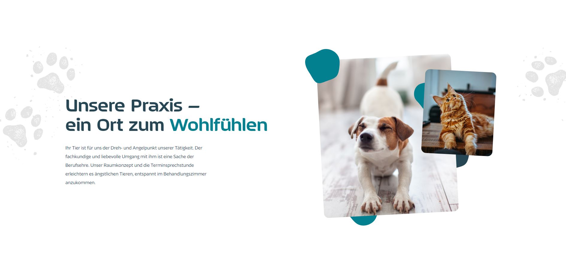 Die Designelemente aus dem Branding ziehen sich auch hier konsequent durch. Organische Formen und die beiden Brandingfarben setzen Bilder und Headlines in Szene. Zur Auflockerung wurden im Hintergrund Pfotenabdrücke eines Hundes gesetzt. Somit fließt ein logoähnliches Grafikelement nochmal mit ein und der tierische Charakter wird verstärkt.