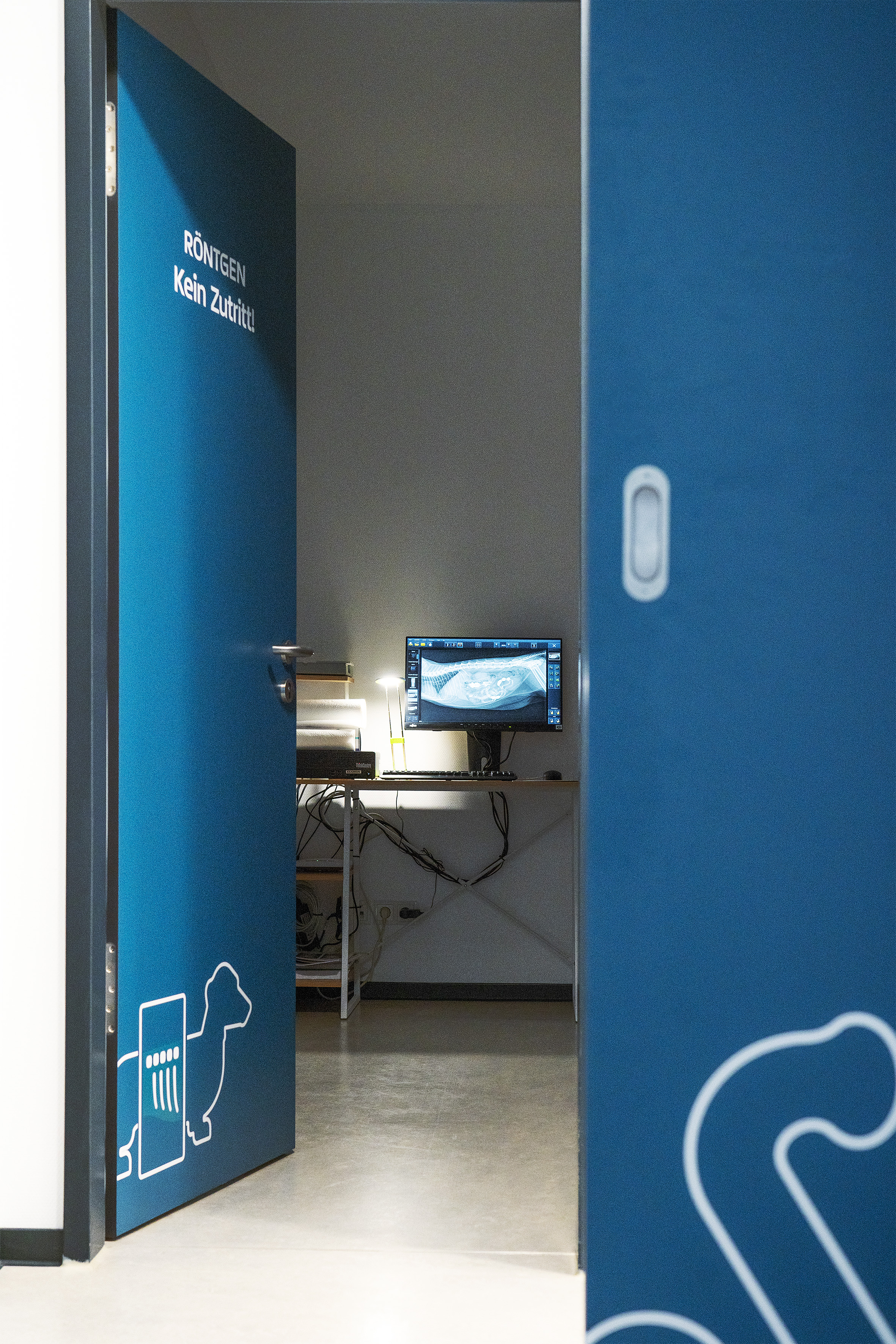 Um eine konsistente Markenwahrnehmung zu gewährleisten, haben wir unsere Ideen ebenfalls für Fußböden, Wände und Türen mit eingebracht und umgesetzt. So erlebt der Patientenbesitzer schon beim Betreten der Praxis das Markendesign. Zur Orientierung für Kunden dienen Türbeklebungen, die durch thematisch passende Tiermotive aufgelockert wurden. Leinwandprints an den Wänden werten die Atmosphäre zusätzlich auf. Hierbei wurde darauf geachtet, dass die Fotos Tiere der Mitarbeiter zeigen. So gibt es zu jedem Bild einen persönlichen Bezug und auch eine Geschichte. Die Farbgebung der Fotografien wurde ebenfalls aufeinander abgestimmt, um ein einheitliches Gesamtbild zu gewährleisten.
